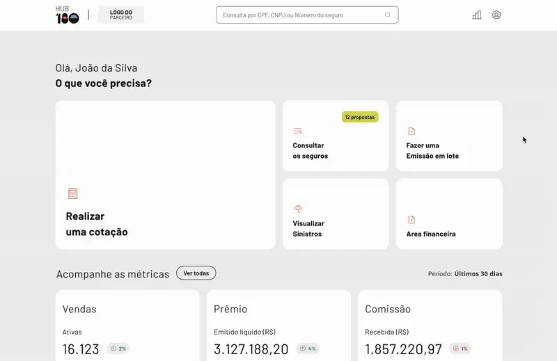 Na prática, o Hub 180 é dividido em dois pilares principais: centro de gestão e plataforma de vendas. Nosso centro de gestão tem as principais funcionalidades para o acompanhamento da sua operação de seguros: